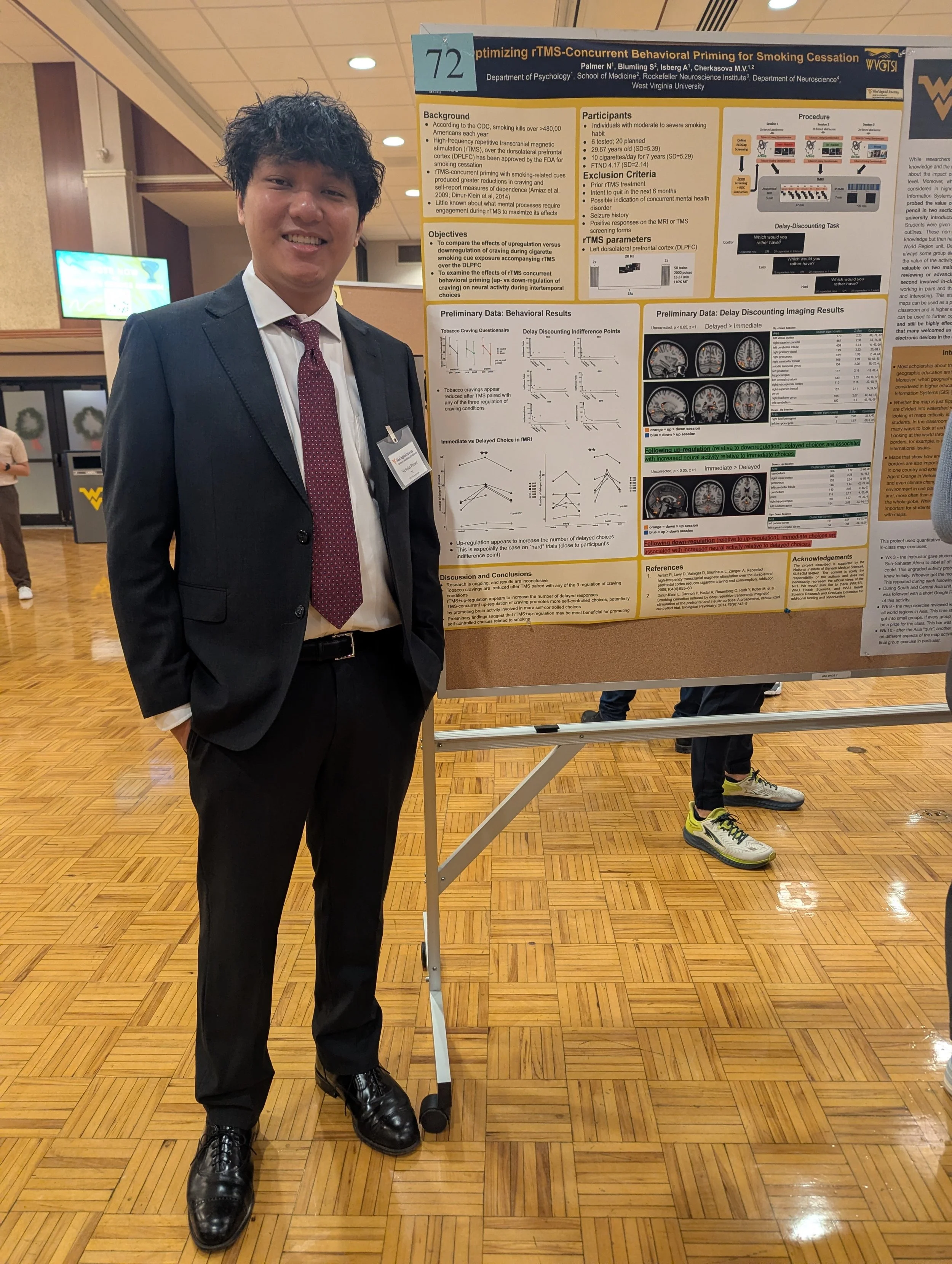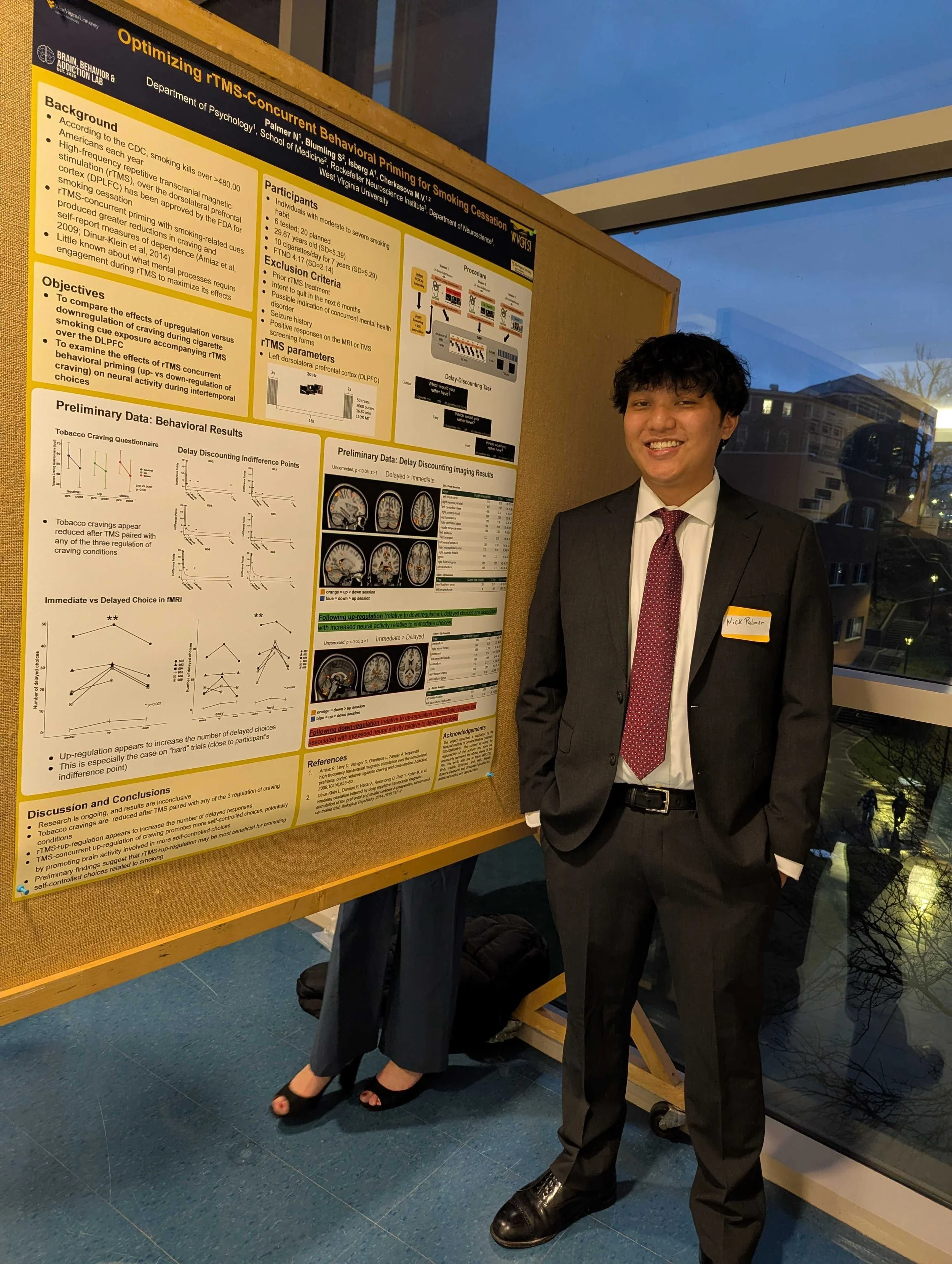 Nick analyzed fMRI data looking at neural correlates of delay discounting following rTMS with concurrent behavioral priming. He also presented these data at the Undergraduate Symposium at WVU (left).